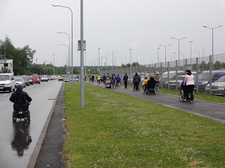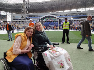 We traveled 4 hours in the cold rain, praying the skies would clear before the outdoor event. In Lviv, we were welcomed by Christian family into their spacious home so that people with disabilities could rest for a couple of hours and eat before the event. It continued to rain all afternoon, but as we arrived and unloaded at the stadium, the rain eased up and then stopped. There was not another drop of rain until we were headed home! We brought electric wheelchairs for people with spinal cord injuries and had to go to 3 entrances to find an accessible way to the stadium.