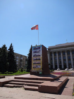 | The statue of Lenin that previously stood on top has been removed and now a banner hangs with the faces and names of men from the region who have died in the war. |